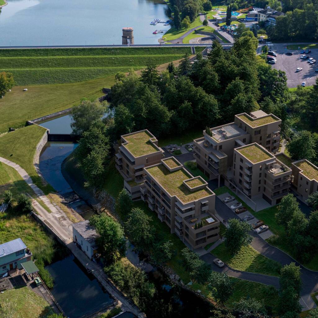 Výsledkem je 58 moderních apartmánů citlivě zasazených do soukromého areálu s privátním parkem a stylovou kavárnou.