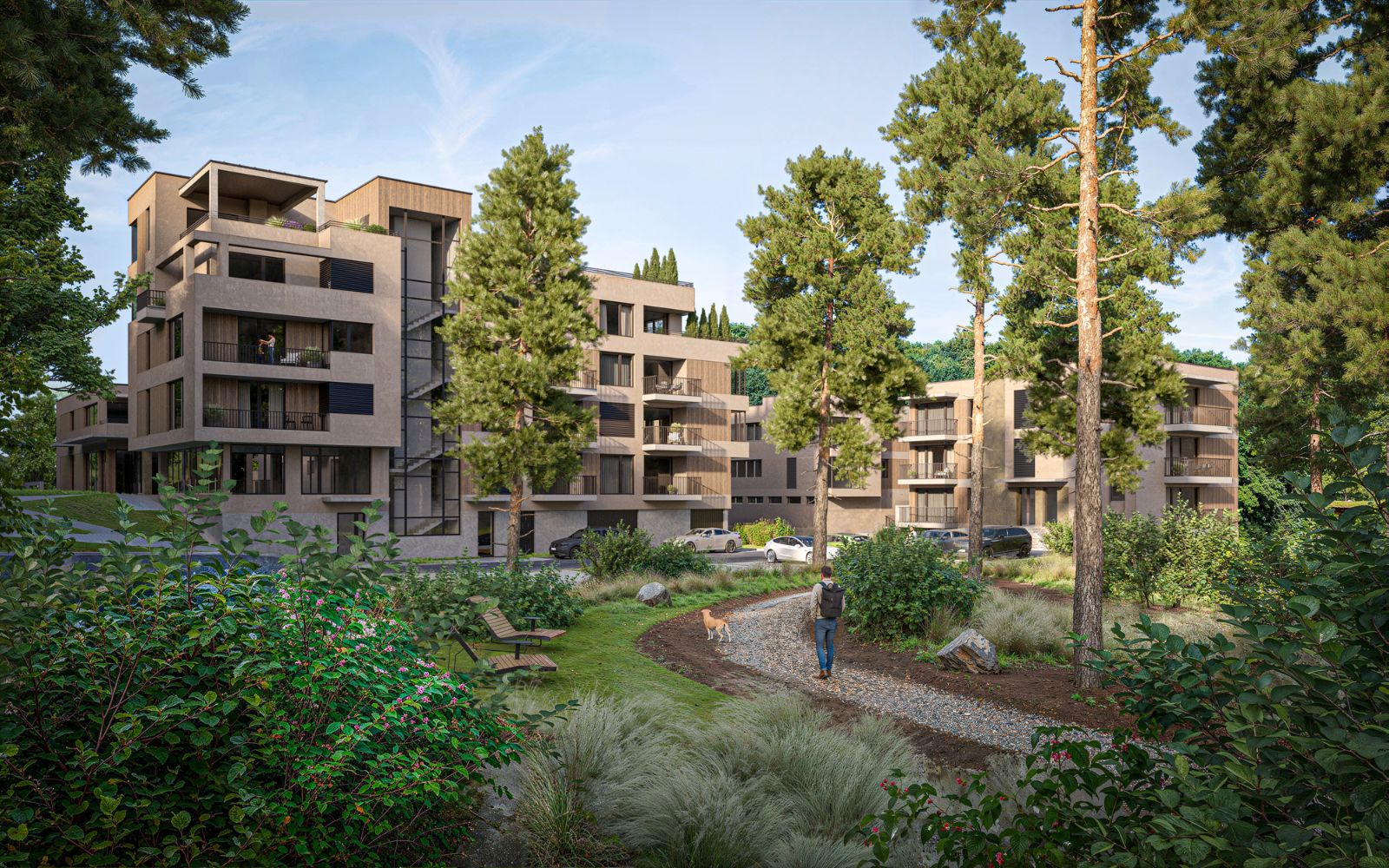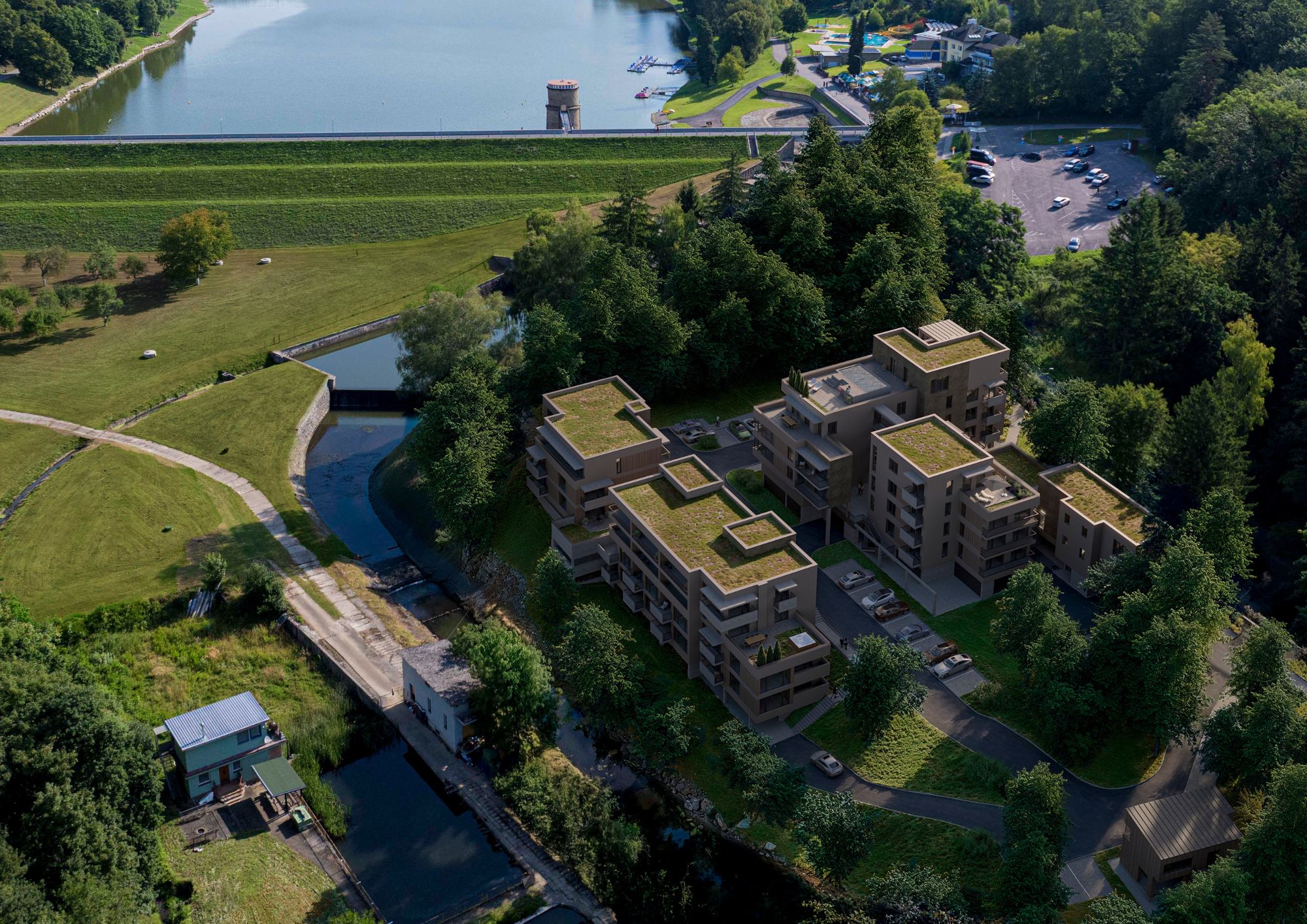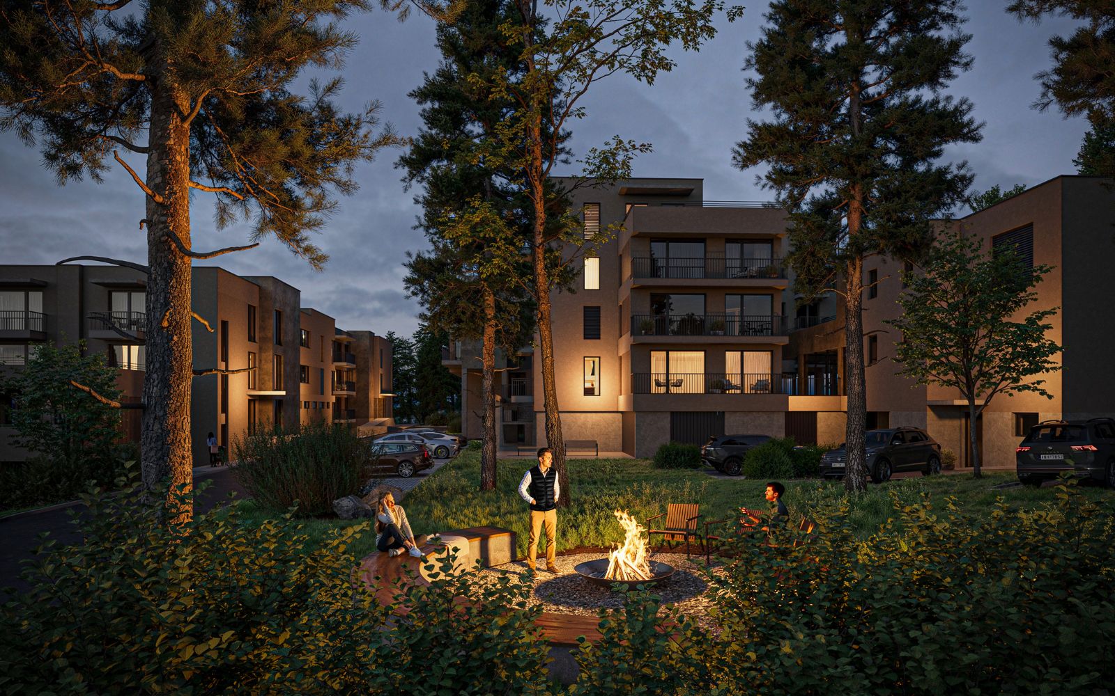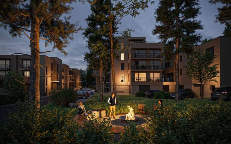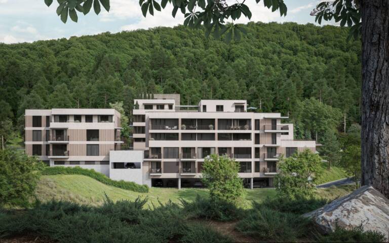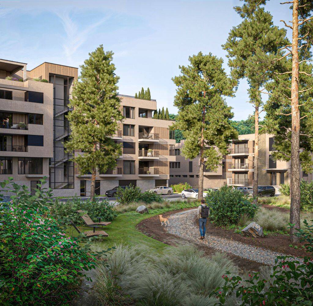 Výsledkem je 58 moderních apartmánů citlivě zasazených do soukromého areálu s privátním parkem a stylovou kavárnou.
