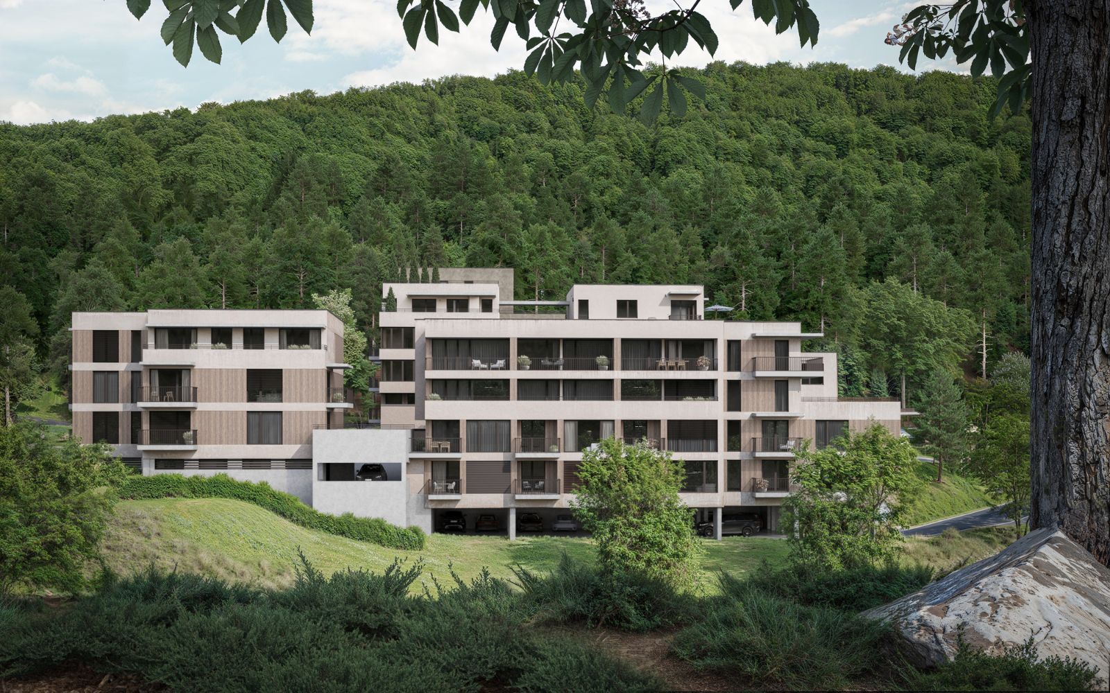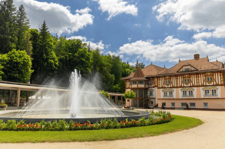 Projekt je lemován Jurkovičovou alejí, která Vás příjemnou procházkou zavede až do samotného srdce Luhačovic.