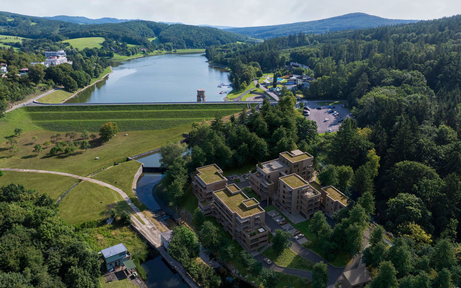 Apartmány U Hladiny se nachází přímo u Luhačovické přehrady, v malebném údolí s čistým vzduchem, obklopeném lesy a kopci Vizovických vrchů.
